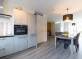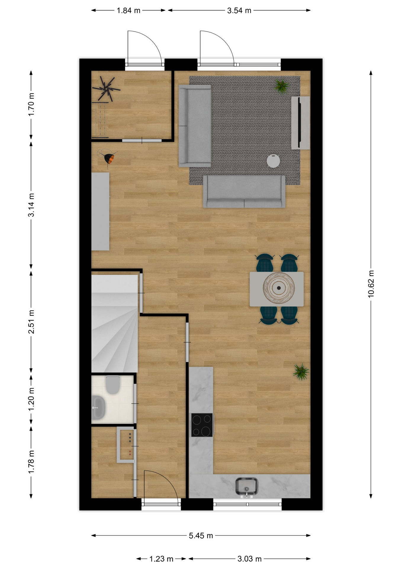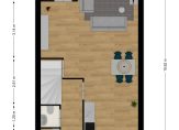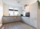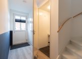 Entree/hal met toilet, meterkast en technische ruimte. Via de hal kom je in de maximaal uitgebouwde woonkamer met handige bijkeuken en trapkast voor provisie. Zowel vanuit de woonkamer als vanuit de bijkeuken loop je naar de achtertuin. Aan de voorzijde is de moderne keuken voorzien van inbouwapparatuur (inductiekookplaat, combimagnetron, vaatwasser, koel- en vrieskast en granieten aanrechtblad). De woonkamer en keuken zijn samen ca. 42 m² groot.