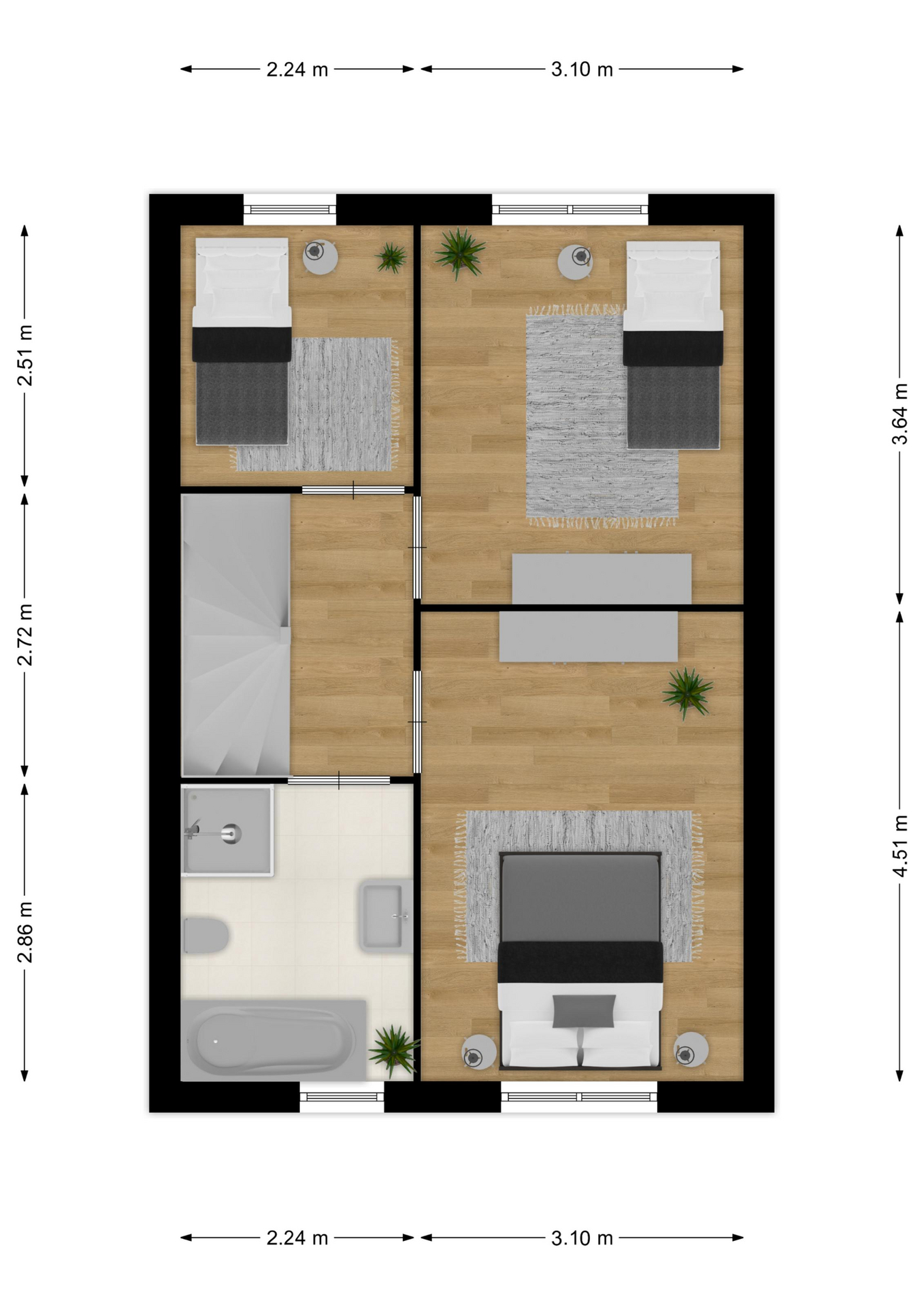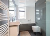 Overloop met 3 slaapkamers van ca. 14, 11 en 6 m² en een moderne en complete badkamer met inloopdouche, dubbele wastafel, ligbad, designradiator en 2e toilet.
