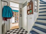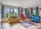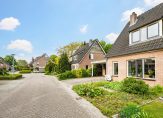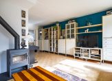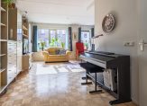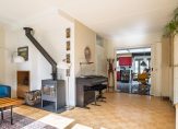 Bij de carport, met lichtkoepel, zie je de dubbele deuren naar de garage en de voordeur. Achter de voordeur is de ruime hal met de meterkast, trapopgang en de toiletruimte met fonteintje. Aansluitend is de L-vormige woonkamer, die geheel als zitkamer ingedeeld kan worden. Het uitzicht is fraai, naar de voortuin en de rustige straat. Sfeermakers zijn de parketvloer met blokmotief en de houtkachel, aangesloten op een in 2023 vernieuwd rookkanaal.