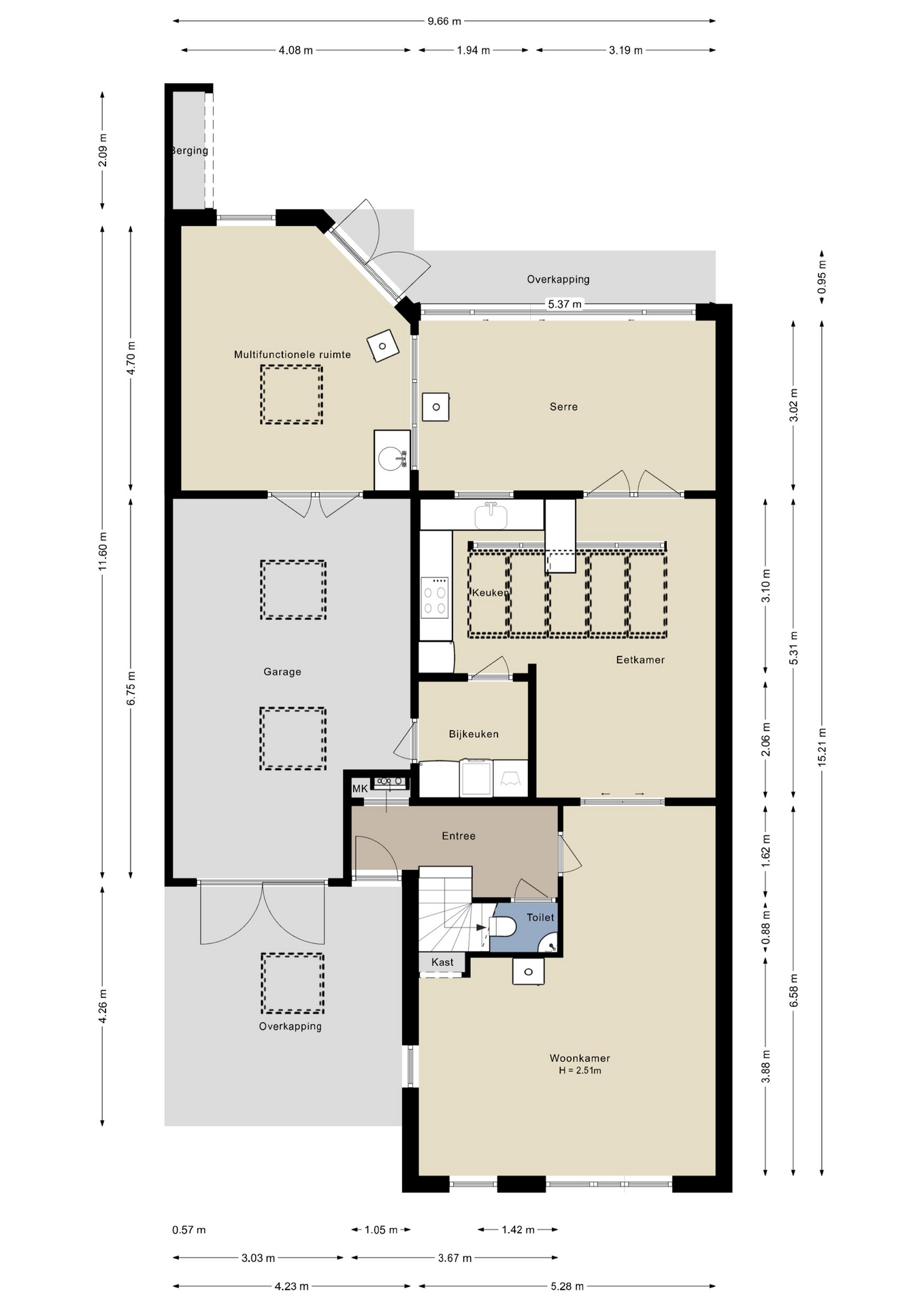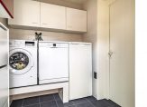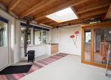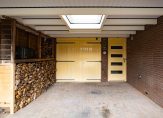 Via de bijkeuken loop je de ruime garage in, met twee lichtkoepels in het platte dak. Dankzij dubbele deuren aan de voorzijde is de garage toegankelijk met een auto, motor en fiets. In het verlengde van de garage is een multifunctionele ruimte met een lichtkoepel en mooi uitzicht naar de tuin.