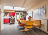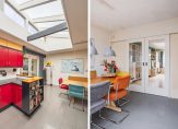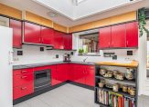 Achter de schuifdeuren is de zeer ruime en lichte woonkeuken, met een grote lichtstraat en openslaande deuren naar de serre. In de woonkeuken ligt een mooie, grijze tegelvloer en de rode keukenopstelling is voorzien van een ingebouwde inductie kookplaat, afzuigkap en een combimagnetron. Erg handig is de bijkeuken, met ruimte voor een vaatwasser, wasmachine en een vriezer.