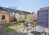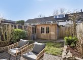 De achtertuin is gelegen op het zonnige zuidwesten met een terras voorzien van zonnescherm aan huis. Verder zijn er een klein gazon en planten borders. Direct aan het huis is een tuinkast voor het tuingereedschap en achter in de tuin staat een houten tuinberging, een ideale stallingsruimte voor spullen en fietsen. Rondom zijn houten schuttingen en tevens is er de beschikking over een achterom.