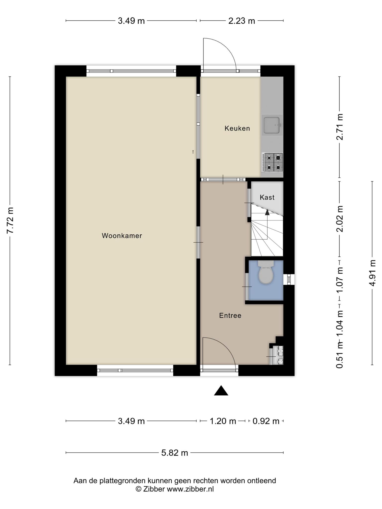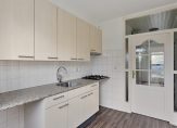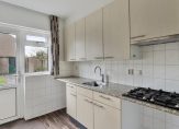 Hal met vernieuwde meterkast, toiletruimte, trapopgang naar de verdieping en trapkast. De hal biedt toegang tot de woonkamer en de dichte keuken. De woonkamer beschikt over veel lichtinval door de grote raampartijen. De dichte keuken is voorzien van een eenvoudig recht keuken blok voorzien van een gaskookplaat en afzuigkap. Vanuit de keuken is er toegang tot de tuin.