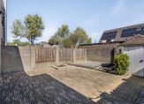 De tuin is gelegen op het oosten en is netjes verzorgd met sierbestrating, rondom een schutting en een zonneterras. Er staat nog een houten tuinhuisje voor wat opslag.