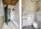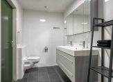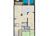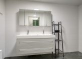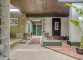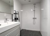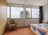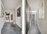Ruime hal met toegang tot de grote leefruimte en een doorloop naar de slaapkamers en badkamer. Beide slaapkamers liggen aan de voorzijde van de woning en beschikken over een screen bij de ramen. De moderne badkamer is voorzien van een grote inloopdouche, toilet en wastafel. Verder is hier nog de technische ruimte met opstelling van de heteluchtverwarmingsketel en de geiser die het warme water verzorgt in de woning. In de voormalige keukenruimte is nu een praktische bijkeuken gemaakt met veel kastruimte en een ingebouwde koelkast. Verder is er een portaal met garderoberuimte en een moderne toiletruimte.