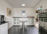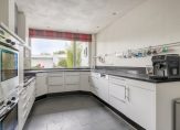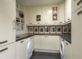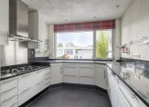 De woonkeuken is eveneens aan de voorzijde van de woning gesitueerd in de ruimte waar voorheen de inpandige garage was bij deze woningen. In de keuken is een vaste eettafel en staat een Siematic inrichting afgewerkt met een granieten blad en voorzien van inbouwapparatuur zoals koelkast, vaatwasser, combi oven/magnetron en kookplaat. Op de vloer ligt leisteen en de wanden/plafonds zijn keurig gestuukt. In de keuken, bijkeuken en badkamer zorgt lichttubes voor extra daglicht.
