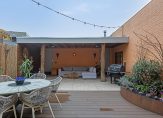 Het dakterras is zeer ruim, is gelegen op het zuiden en biedt veel privacy. Het dakterras is zeer fraai en sfeervol aangelegd en aan de woning voorzien van een groot terras voorzien van duurzame composiete vlonders, een zonnescherm aan de gevel en planten borders. Achter op het dakterras staat een grote overkapping met keramische tegels, dit is een ideale plek voor een grote loungebank. Vanuit het dakterras is er toegang tot een berging geschikt voor opslag.