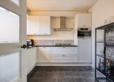 U komt binnen in de hal, waar u de trapopgang naar boven aantreft evenals de vernieuwde meterkast en de moderne en luxe toiletruimte. Vervolgens komt u in de woonkamer welke circa 30 m² groot is en voorzien is van een eikenhouten vloer en open haard. Aan de achterzijde is een schuifpui die toegang geeft tot de tuin. De woonkeuken bevindt zich aan de voorzijde van de woning. De keuken is voorzien van een tegelvloer en lichte keukeninrichting in hoekopstelling voorzien van een 5 pits gaskookplaat, rvs afzuigkap, combi oven/magnetron, koelkast en vaatwasser.