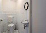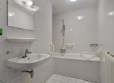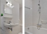 Vanuit de hal is er toegang tot twee slaapkamers, de badkamer en het separate toilet. De badkamer is volledig betegeld en voorzien van een ligbad en wastafel. Het toilet is voorzien van een toilet en fontein.