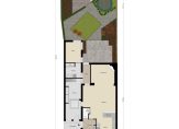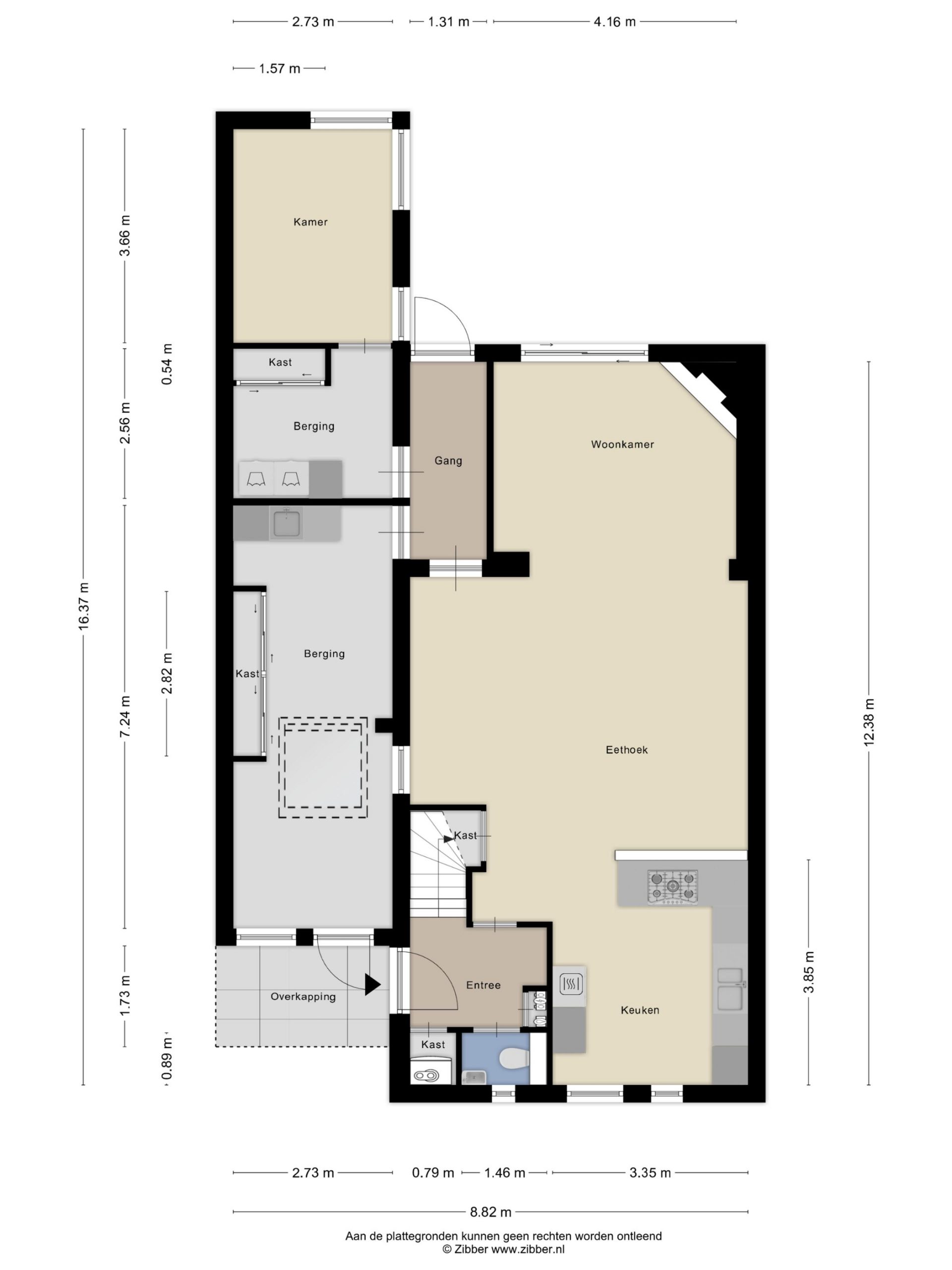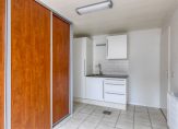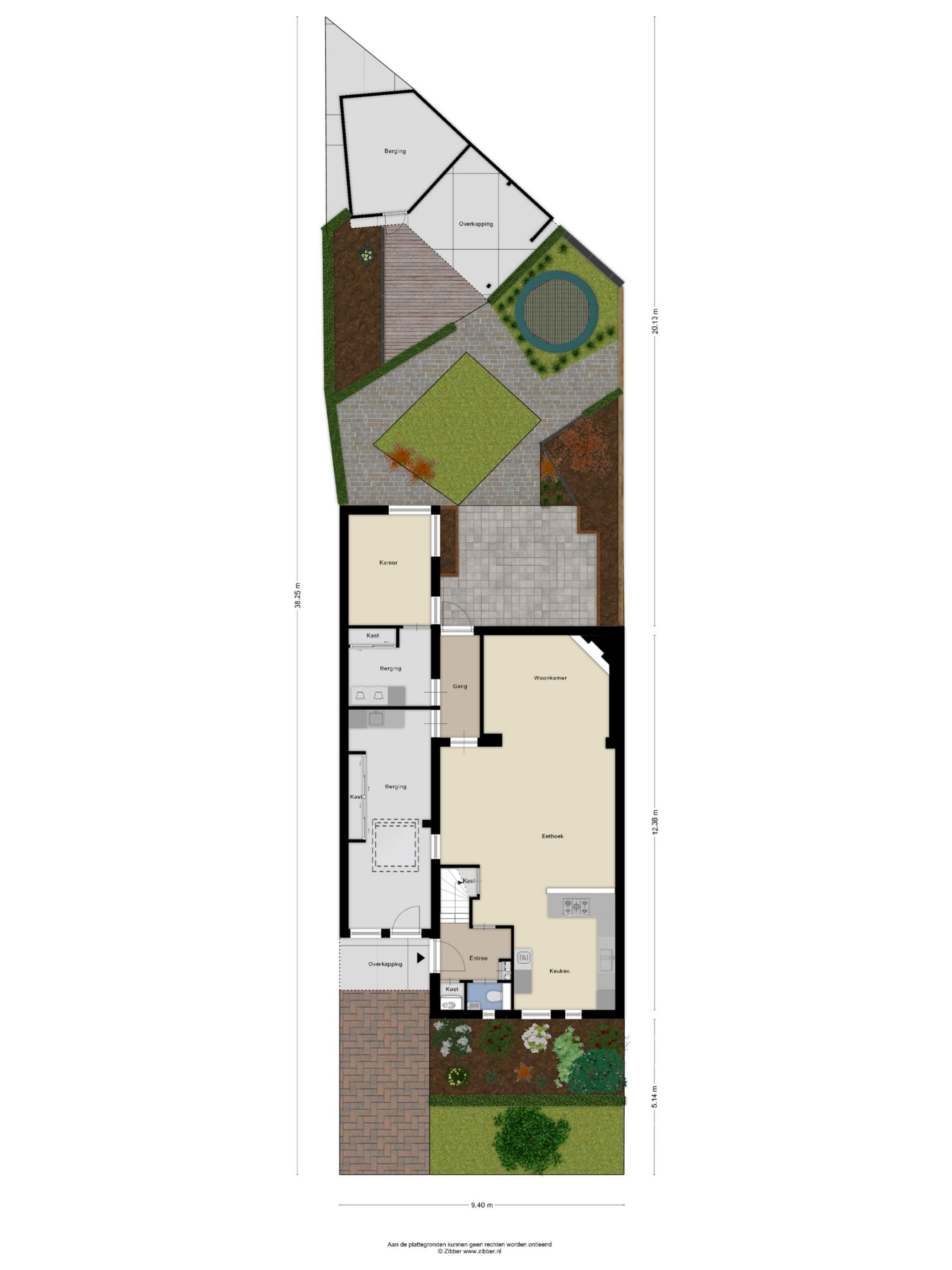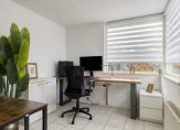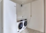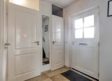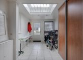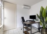 Een portaal/doorgang verbindt de leefruimte met de berging/bijkeuken en werkkamer. Vanuit deze doorgang is ook direct toegang tot de tuin. In de bijkeuken zijn de aansluitingen voor het witgoed. Aan de tuinzijde is een werkkamer van 10 m² groot. Dit is een ideale ruimte om vanuit thuis te werken, maar ook kan ook dienst doen als speelruimte of eventueel slaapkamer. Bij de bijkeuken zijn ook aansluitingen voor het realiseren van een badkamer, waardoor het goed mogelijk is om de woning aan te passen en levensloopbestendig te wonen. De berging aan de voorzijde van de woning is een multifunctionele ruimte. Niet alleen is hier ruimte voor het stallen van fietsen, maar de ruimte kan ook goed dienst doen voor een kantoor-/praktijkruimte aan huis. Er is een lichtkoepel voor extra daglichttoetreding, een grote schuifkast en een keukenblokje.