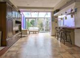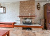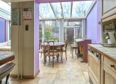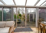 entree, hal met meter- en trapkast, toilet, royale woonkamer met open haard en aangebouwde serre, eenvoudige open keuken voorzien van diverse apparatuur