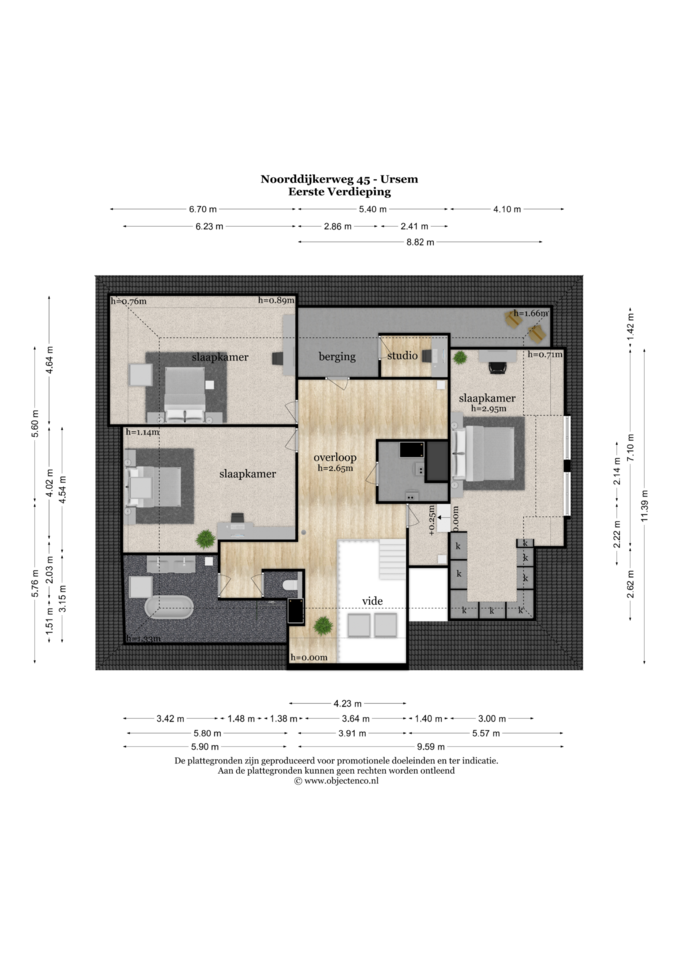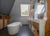 Op de eerste etage bevindt zich een royale overloop, met toegang tot drie ruime slaapkamers, waarvan de hoofdslaapkamer beschikt over een riante inloopkast. De badkamer is modern en voorzien van een vrijstaand ligbad, inloopdouche, dubbele wastafel en vloerverwarming. Ook vindt u hier een tweede toilet, inpandige berging, cv-/technische ruimte en een geluidsstudio.