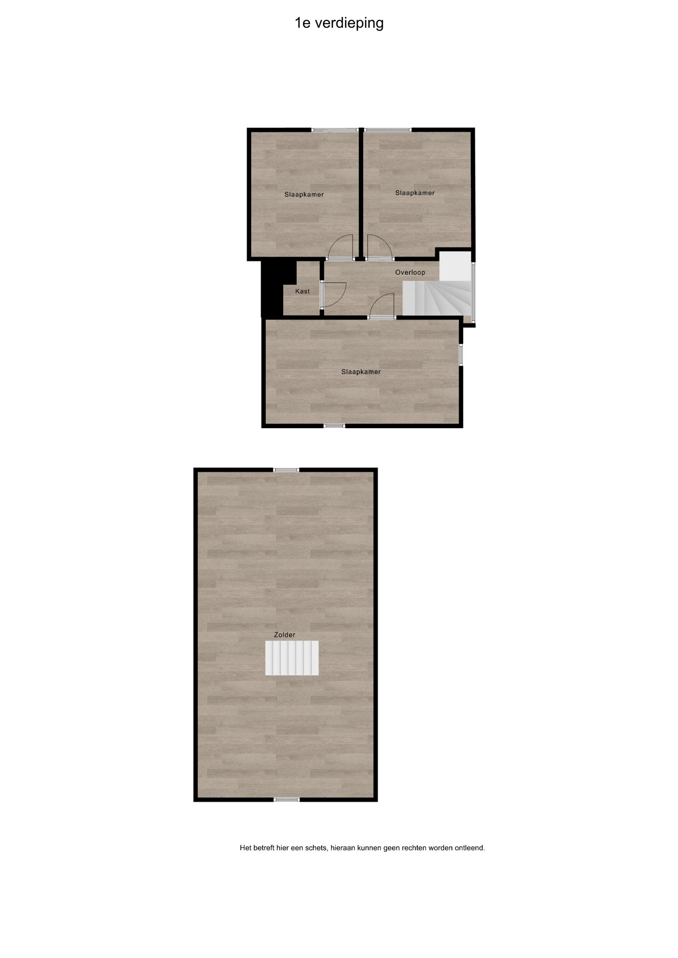 1e verdieping: v.v. laminaatvloer, overloop met toilet, 3 slaapkamers ca. 425×200, 340×217 en 340×210.