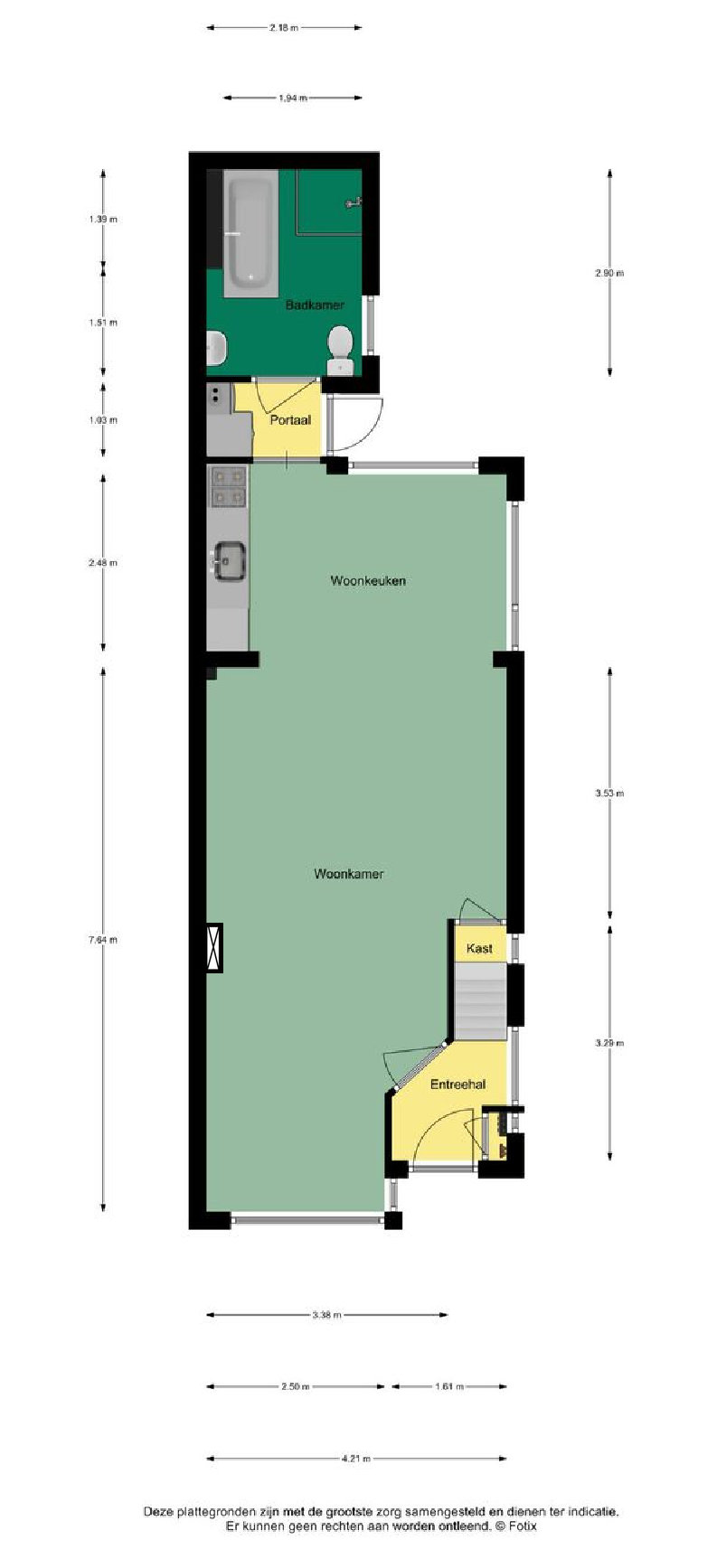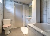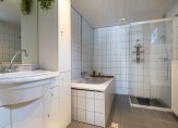 De woonkeuken is voorzien van een nette inbouwkeuken in gebroken witte kleurstelling, afgewerkt met een wit/grijs gemarmerd kunststof aanrechtblad. Deze inbouwkeuken is uitgerust met een koelkast, vriesladen, spoelbak, elektrische heteluchtoven, 4-pits gaskookplaat en afzuigkap. In het aangrenzende achterportaal vinden we de aansluitingen voor de vaatwasser en de wasmachine en ook staat hier de VHR-cv-combiketel opgesteld (merk: Vaillant / type: VHR-c / bouwjaar: ca. 2000). Vanuit het achterportaal hebben we toegang tot zowel de badkamer als de tuin. De eenvoudige, verouderde badkamer is voorzien van een wastafelmeubel, ligbad, douchecabine, radiator en toilet en is geheel betegeld met wit/grijs gemarmerde wandtegels en grijze vloertegels.