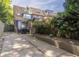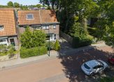 De voortuin is ingericht met beplanting en bestrating en biedt parkeergelegenheid op eigen terrein. De markies boven de erker benadrukt het authentieke karakter van de woning.