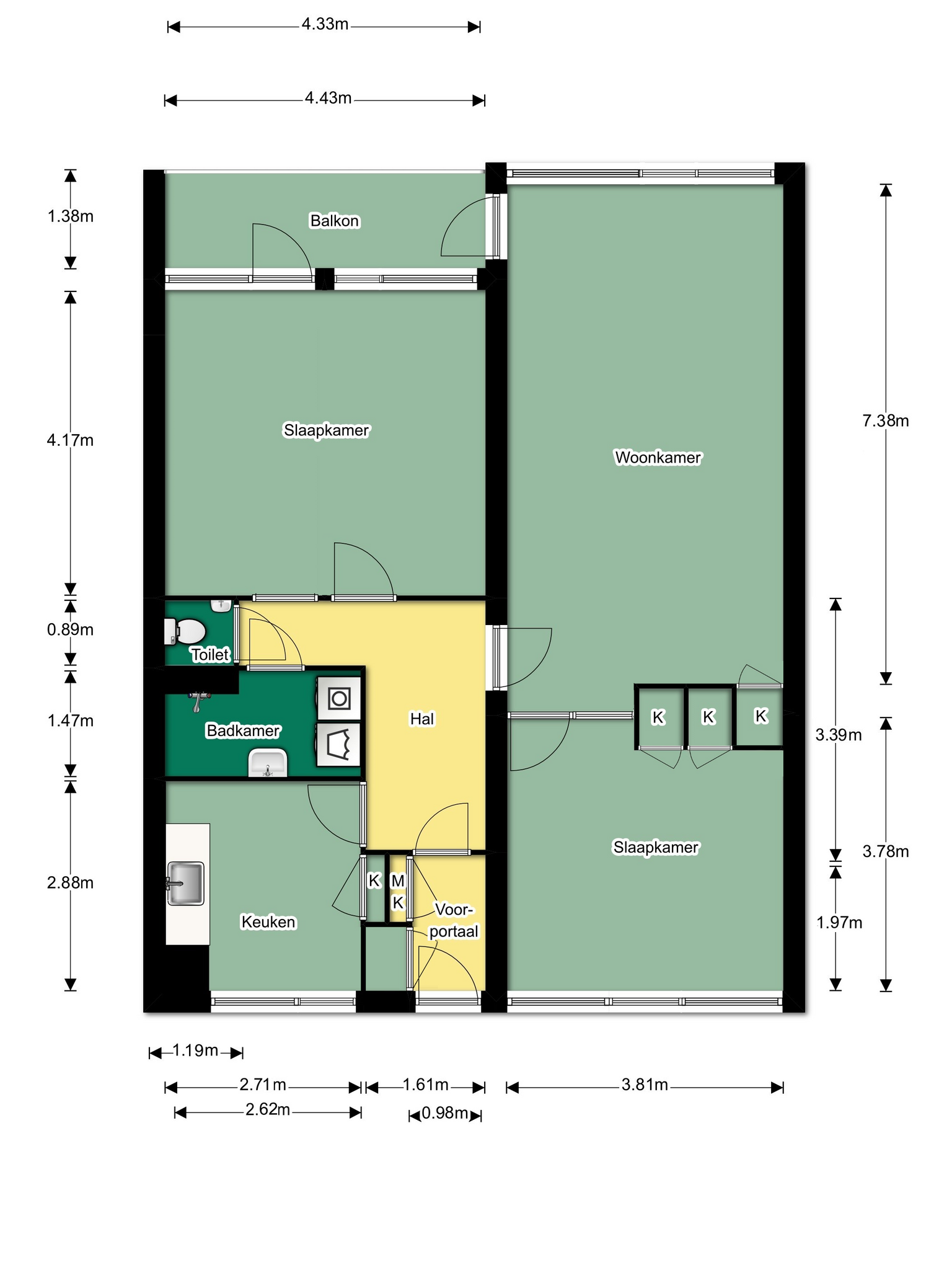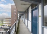 Je komt het appartement binnen in het voorportaal, dat voorzien is van een vaste kast en een meterkast. Vanuit het voorportaal loop je de ruime hal in, waar je de intercominstallatie vindt en waarvandaan er toegang is tot de keuken, badkamer, toiletruimte, woonkamer en de 2 slaapkamers.