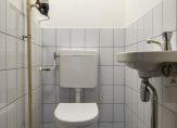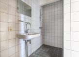 De badkamer is voorzien van een wastafel met planchet en spiegel, een douche en een aansluiting voor de wasmachine. De wanden zijn volledig betegeld met witte tegels en op de vloer liggen grijze tegels. De toiletruimte is voorzien van een toilet en een fonteintje en is in dezelfde kleurstelling betegeld als de badkamer.