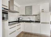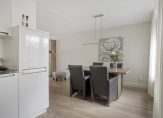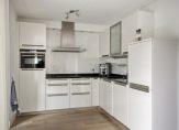 De keuken is tuingericht met een kamerbrede pui, waardoor je optimaal van licht en tuincontact geniet. De L-vormige keuken is stijlvol uitgevoerd met witte fronten en een zwart gemêleerd natuurstenen aanrechtblad. Je hebt hier de beschikking over een combi-oven, inductiekookplaat, RVS-afzuigschouw, spoelbak, vaatwasser, diepvries en een koelkast.