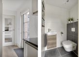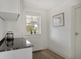 Ook hier leidt een deur met 3 glazen panelen je naar de bijkeuken. Deze is praktisch ingericht met een extra keukenblok (in dezelfde stijl als de hoofdkeuken) en hiervandaan krijg je toegang tot de toiletruimte, de garage en de tuin. De toiletruimte is voorzien van een wandcloset en een fonteintje met houtlook meubel. De stijlvolle en tijdloze witte en antracietkleurige tegels zorgen hier voor een fraaie basis.