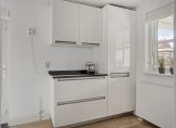Via een deur met drie glazen panelen kom je in de woonkamer en woonkeuken, die samen ruim 44m2 woonplezier bieden. De woonkamer is aan de straatzijde gesitueerd en is licht en sfeervol dankzij de ramen met roedeverdeling aan de voor- en zijkant, een gashaard en een lamelparketvloer met hoge witte plinten.