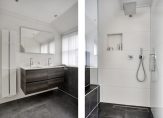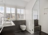 De moderne badkamer is uitgevoerd in dezelfde stijl als het toilet op de begane grond en beschikt over een ruime douchehoek met glazen deur, betegeld zitbankje, nis voor douchespullen en een ingebouwde regen- en handdouche. Verder is de badkamer voorzien van een wandcloset, een houtlook wastafelmeubel met dubbele wastafel en kranen, een brede spiegel met verwarming en led-verlichting en een designradiator met handdoekbeugels. Inbouwspots in het plafond zorgen voor een aangename verlichting.