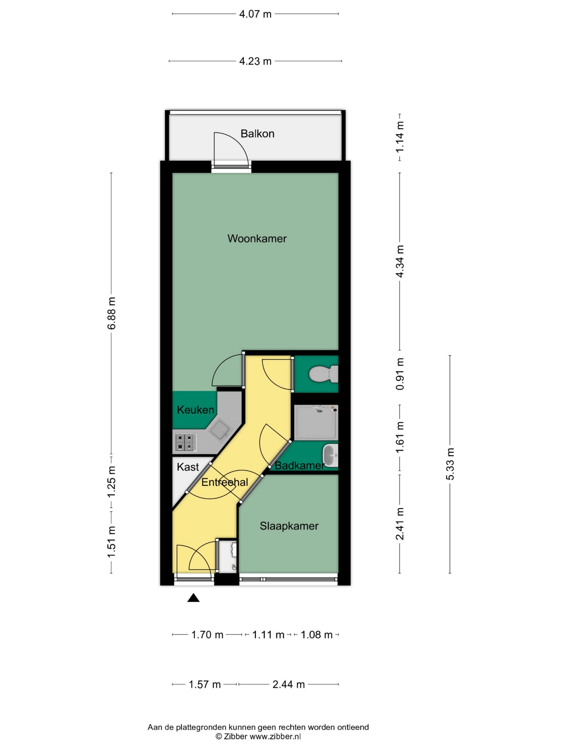 Je komt het appartement binnen in de hal, waar je de videofooninstallatie vindt en een vaste kast met daarin in de aansluiting voor de wasmachine, de elektrische boiler (80 liter) en de mechanische ventilatie-unit. Vanuit de hal heb je toegang tot de slaapkamer, badkamer, toiletruimte en woonkamer/ keuken.