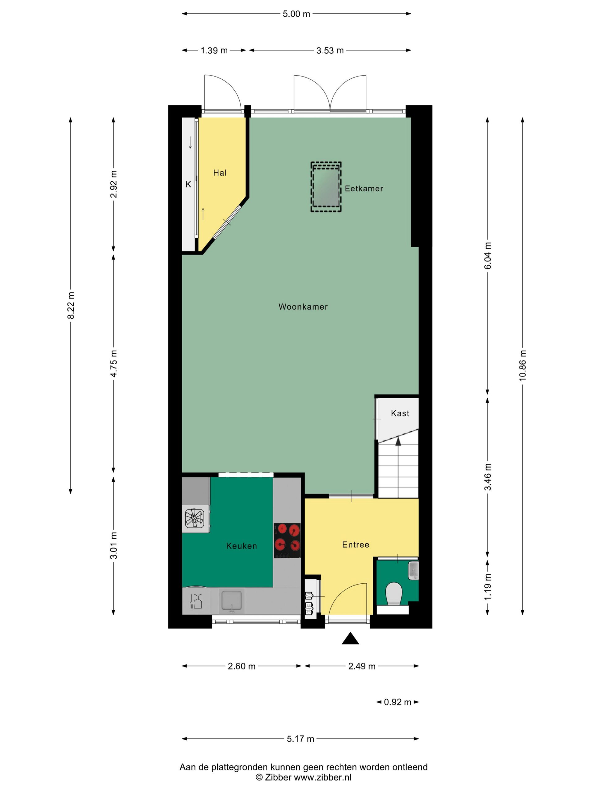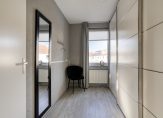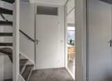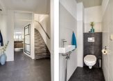 Je komt de woning binnen in de ruime L-vormige entreehal, waar je de meterkast, een garderobehoek met inbouwspot, de toiletruimte en de trapopgang vindt. De toiletruimte is voorzien van een wandcloset en een fonteintje en de witte wandtegels in combinatie met de antracietkleurige plavuizen zorgen voor een nette en tijdloze uitstraling.