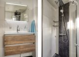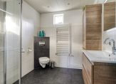 De badkamer is smaakvol ingericht met een houtstructuur wastafelmeubel, spiegel met verlichting, bijpassend wandmeubel, handdoekenradiator, wandcloset en een douchecabine met regen- en handdouche. De afwerking is fraai: drie wanden zijn betegeld met witte tegels, terwijl de wand achter het toilet, de douchewand en de vloer zijn voorzien van antracietkleurige tegels. Het kunststof plafond met inbouwspots maakt het geheel compleet.