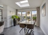 Via een fraaie deur met matglas krijg je toegang tot de uitgebouwde en tuingerichte woonkamer. Hier vind je een praktische trap-/provisiekast en openslaande deuren die toegang geven tot de tuin. Door de lichtkoepel en de kamerbrede pui profiteer je hier van een fijne lichtinval. De inbouwspots boven de openslaande deuren zorgen in de avonduren voor een sfeervolle ambiance.