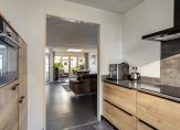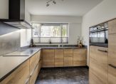 De straatgerichte keuken wordt via een strakke toog van de woonkamer gescheiden en is voorzien van een L-vormige inbouwkeuken met bijpassend wandmeubel. In het wandmeubel zijn de koelkast, vriezer en combimagnetron ondergebracht en het lage, L-vormige gedeelte is voorzien van een vaatwasser, spoelbak, inductiekookplaat en een afzuigkap. De houtstructuur fronten en het antracietkleurige betonlook kunststof werkblad geven de keuken een moderne en warme uitstraling.