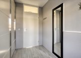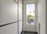 Een groot pluspunt is het achterportaal: hierdoor komen kou en vieze schoenen niet direct in de woonkamer. Ook hier is gekozen voor een moderne zwarte deur met matglas. Een grote schuifkastenwand biedt volop bergruimte en een deur geeft toegang tot de achtertuin.