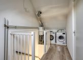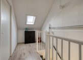 De overloop beschikt over een Velux-dakraam met verduisteringsgordijn, bergruimte achter knieschotten, aansluitingen voor de wasmachine en droger, mechanische ventilatie-unit en de HR CV-combi-ketel (Remeha Avanta uit 2012).