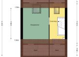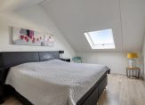 De slaapkamer is voorzien van een groot dakraam met verduisteringsgordijn en heeft aan weerszijden bergruimte achter knieschotten.