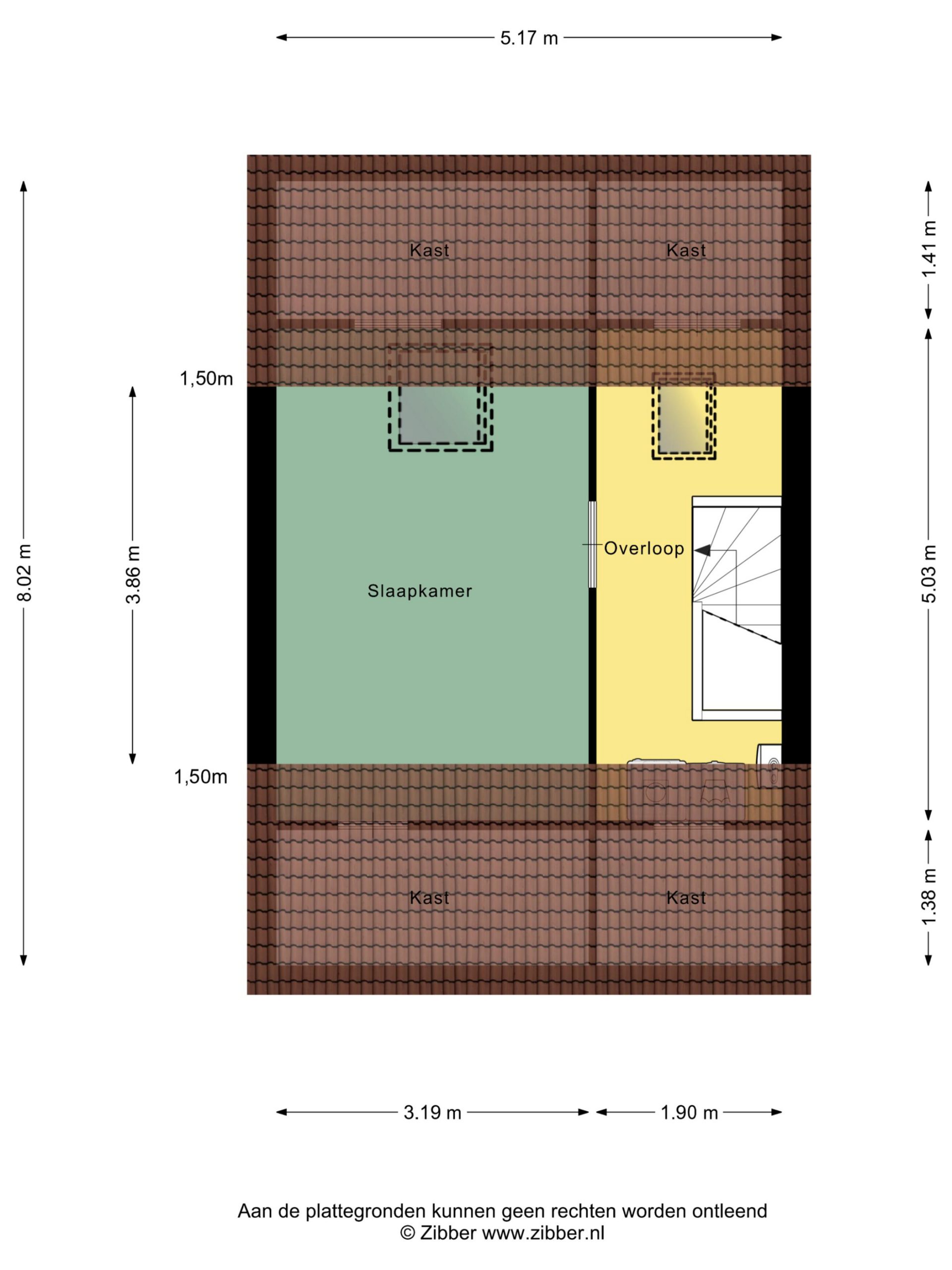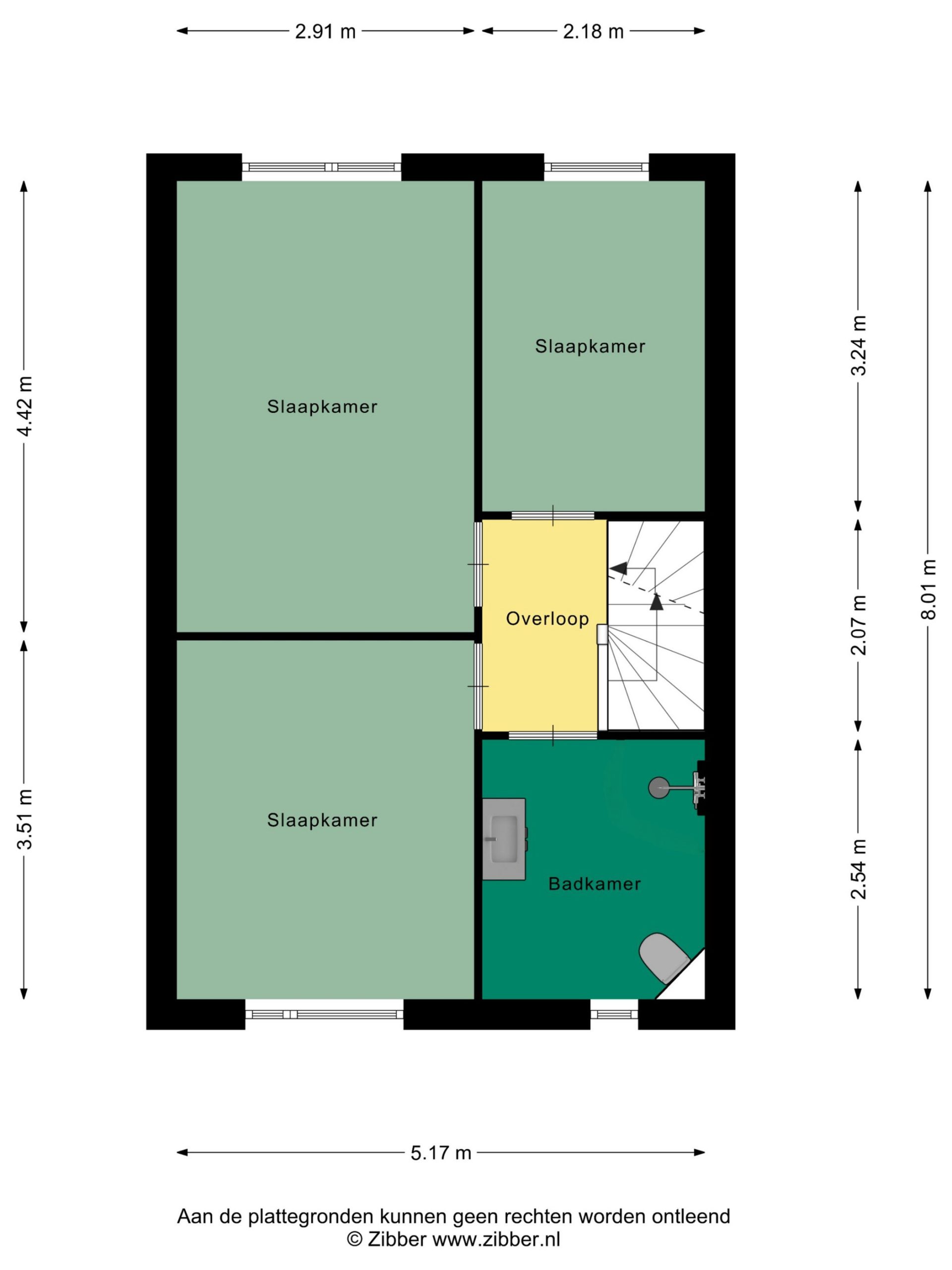 Aan de overloop grenzen 3 ruime slaapkamers en de badkamer. De slaapkamers hebben met 13, 10 en 7m2 bruikbare afmetingen.