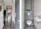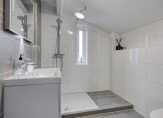 De moderne badkamer is strak en tijdloos afgewerkt met witte wandtegels tot aan het plafond en antracietkleurige tegels op de vloer en de wand links. Hier beschik je over een wastafelmeubel, spiegel met verlichting, inloopdouche met glazen scheidingsscherm, zwevend toilet, een designradiator én vloerverwarming; een ruimte waar functionaliteit en comfort perfect samenkomen.
