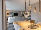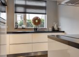 De half open keuken is modern en goed doordacht ingericht, met hoogglans witte fronten en een antraciet gemêleerd natuurstenen aanrechtblad. Alle belangrijke apparatuur is ingebouwd, waaronder een wijnklimaatkast, stoomoven, combi-oven, koelkast en diepvries. Het kookeiland beschikt over een inductiekookplaat met vijf zones, een afzuigschouw en een bar, perfect voor een informeel ontbijt of een kop koffie. Onder het raam zijn de spoelbak en vaatwasser netjes geïntegreerd.