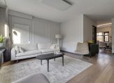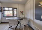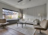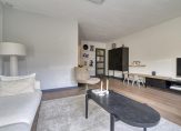 Via een deur met vier glazen panelen kom je in de woonkamer en woonkeuken, die samen ruim 38m2 woonplezier bieden. De woonkamer is aan de tuinzijde gesitueerd en is licht en sfeervol dankzij het grote raam in de achtergevel, de gestuukte wanden met enkele wandpanelen, de massief eiken vloer en de hoge plinten. Een deur geeft toegang tot de tuin.