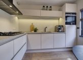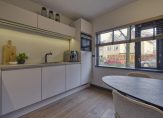De woonkeuken is straatgericht en is voorzien van een moderne L-vormige inbouwkeuken met matwitte fronten en een betonlook aanrechtblad. De keuken is compleet uitgerust met een 5-pits gaskookplaat, recirculatiekap, spoelbak, Quooker, vaatwasser, oven en koelkast.