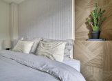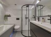 De badkamer is heel compleet en voorzien van een ligbad, handdoekenradiator, wandcloset, douchecabine met regen- en handdouche en een breed wastafelmeubel met dubbele kraan en spiegel. De vloerverwarming zorgt voor warme voeten en de wanden zijn afgewerkt met witte tegels. De voorzijde van het bad en de vloer zijn voorzien van grijze tegels. Ook hier zorgen de zwarte accenten (douchecabine, kranen, wastafelmeubel etc) voor een moderne uitstraling.