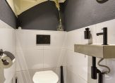 Tussen woonkamer en keuken ligt een portaal met daarin de trapopgang en de toiletruimte. De toiletruimte is voorzien van een wandcloset en een fonteintje en is afgewerkt met witte wandtegels en grijze vloertegels. Zwarte accenten zoals o.a. het kraantje, zeeppompje en wc-rolhouder zorgen voor een moderne en eigentijdse uitstraling.