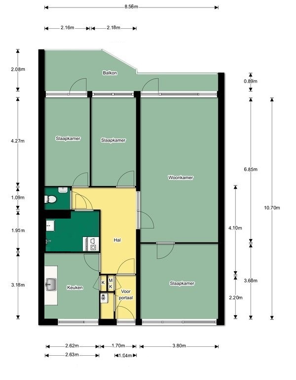 De 3 slaapkamers hebben met 15m2, 9m2 en 9m2 bruikbare afmetingen. De ouderslaapkamer is gesitueerd aan de galerijzijde en is voorzien van 2 losse kasten. De andere 2 slaapkamers bevinden zich aan de balkonzijde en een van deze kamers is voorzien van een deur naar het balkon.