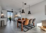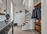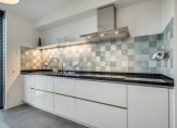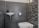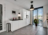 Je komt de woning binnen in de ruime entreehal, die voorzien is van een toiletruimte, meterkast en de trapopgang. De toiletruimte is voorzien van een wandcloset en een fonteintje en is betegeld met antracietkleurige wand- en vloertegels; deze kleurstelling wordt speels doorbroken door mozaïektegels in diverse grijstinten tegen de wand achter toilet. Via een deur met 2 hoge glazen panelen krijg je toegang tot de woonkamer en keuken, die samen maar liefst 49m2 woonplezier bieden! De keuken is straatgericht en een weerszijden voorzien van een ruime keukenopstelling met hoogglans witte fronten en een antracietkleurig composiet aanrechtblad. In het lage wandgedeelte heb je de beschikking over een matzwarte inductiekookplaat, afzuigkap, vaatwasser en 1½ spoelbak. In het hoge wandgedeelte zijn de koelkast, vriesladen en de combi oven ondergebracht en is aansluitend een koffiecorner gecreëerd.