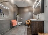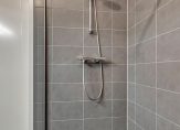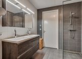 De ruime badkamer (8m2) is in dezelfde kleurstelling betegeld als de toiletruimte op de begane grond en is ingericht met een breed wastafelmeubel met dubbele kraan, spiegelkast, elektrische radiator, wandcloset en een ruime inloopdouche met glazen scheidingsscherm.