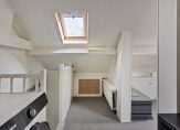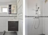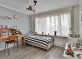 Aan de overloop grenzen 3 slaapkamers en de badkamer. De slaapkamers zijn alle drie recht opgetrokken en in combinatie met de afmetingen (11m2, 10m2 en 6m2) zijn ze daardoor praktisch in te richten. Daarnaast zijn ze alle drie voorzien van een rolluik en een inbouwkast. De badkamer is voorzien van een wastafelmeubel met spiegelkastje, een designradiator en een douchehoek. De wanden zijn betegeld met lichte gemarmerde tegels met een decorrand en op de vloer liggen antracietkleurige plavuizen.