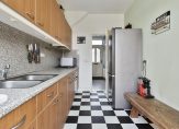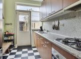 De keuken is voorzien van een deur naar de tuin en een inbouwkeuken met houtstructuur fronten en een granitolook kunststof aanrechtblad. Je hebt hier de beschikking over een oven, gaskookplaat en een dubbele spoelbak.