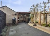 Wat een heerlijke tuin heb je hier tot je beschikking! Gesitueerd op het zuidwesten, dus van de eerste zonnige lentedag tot de laatste zonnige herfstdag is dit een heerlijke plek om van het buitenleven te genieten. Zoek je toch liever de schaduw op? Ook dat kan, want achterin de staat een gezellige veranda, die aan de stenen berging grenst. Maar je kunt ook het zonnescherm bij de achtergevel laten zakken. De tuin is grotendeels voorzien van bestrating, waardoor je niet alleen meerdere zitjes kunt creëren, maar ook met een groot gezelschap buiten kunt zitten. Aan de linkerzijde is in 2024 een nieuwe schutting van zwarte douglasplanken geplaatst. Ervoor ligt een border met lavendel en aan de rechterzijde ligt een verhoogde border met beplanting en 2 lei-sierappelbomen.