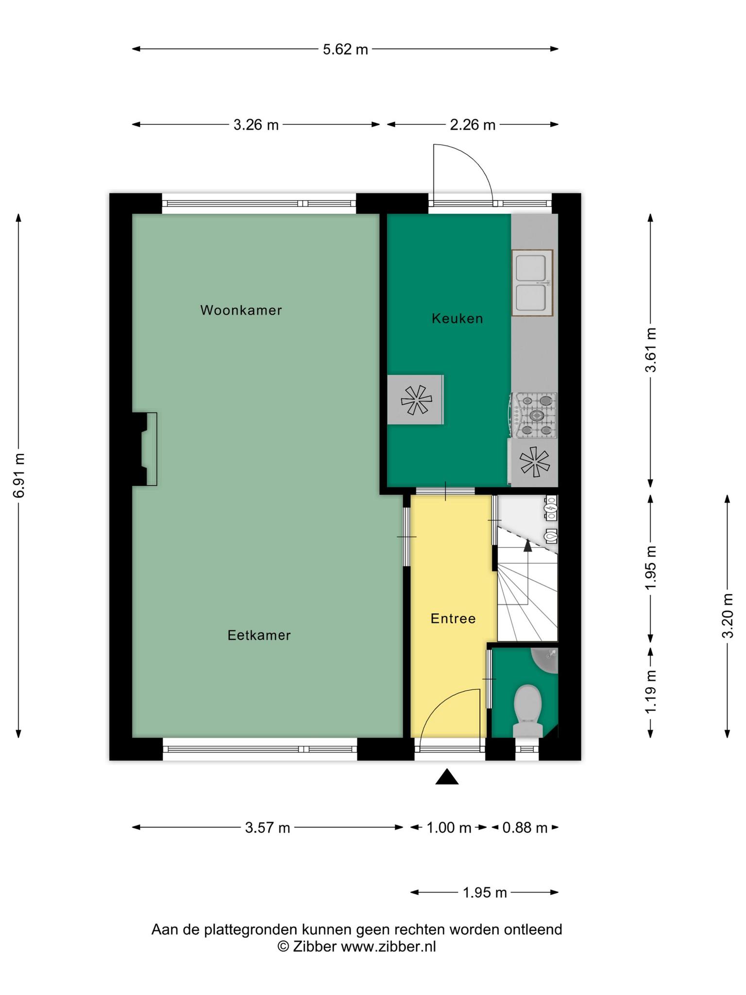 Via de voortuin kom je bij de voordeur. Achter deze voordeur bevindt zich de entreehal, die voorzien is van een toiletruimte, trapopgang en trap-/voorraadkast met meterkast. De toiletruimte is voorzien van een toilet en een fonteintje en is betegeld met lichte gemarmerde wandtegels en antracietkleurige plavuizen.
