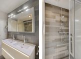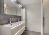 Vanuit de grootste slaapkamer bereikt u de badkamer, die in 2016 is vernieuwd. Deze is compleet ingericht met een breed wastafelmeubel met dubbele wastafel en kranen, een bijpassend wandmeubel, een grote spiegelkast met verlichting, een handdoekenradiator en een ruime douchehoek met glazen schuifdeur en een handig nisje voor toiletartikelen. De afwerking met witte wandtegels en taupekleurige wand- en vloertegels zorgt voor een tijdloze uitstraling.