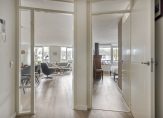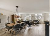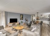 Vanuit de hal komt u via een deur met 3 glazen panelen in de woonkamer met open keuken. Hier komt alles samen wat dit appartement zo prettig maakt: licht, ruimte en comfort. Met een oppervlakte van circa 47m2 is dit een royale leefruimte, waar grote ramen zorgen voor een mooie lichtinval. De ramen zijn grotendeels voorzien van handbediende screens, wat bijdraagt aan het wooncomfort.