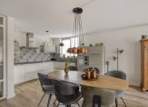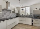De in L-vorm opgestelde inbouwkeuken (2015) is uitgevoerd met witte fronten en een antracietkleurig gemêleerd composiet werkblad. De bovenkasten en de hoge kastenwand met houtlook fronten geven de keuken een warme uitstraling. Uiteraard is de keuken voorzien van diverse inbouwapparatuur, waaronder een inductiekookplaat (2020), RVS-recirculatiekap, spoelbak, vaatwasser, koelkast (2025) en een combi-oven. Ook is in 1 van de laden een afvalscheidingssysteem ondergebracht.